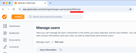 - You will need to provide a list of your users and their GetAccept UserId. This can be found by editing the user in the manage user section and getting the ID from the URL: https://app.getaccept.com/settings/manage-users/user/p398rmyp