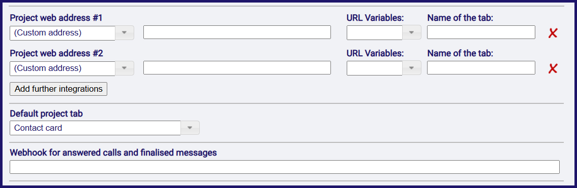 Type or paste the address of the external site into the Webhook for answered calls and finalised messages field.